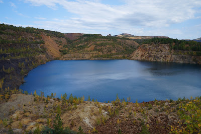 Его отработка закончилась сравнительно недавно, в начале 2000-х, и воды на дне пока немного. Глубина впечатляет – больше 200 м. На северо-восточном борту карьера геологическая красота – обнажение огромной складки горных пород.